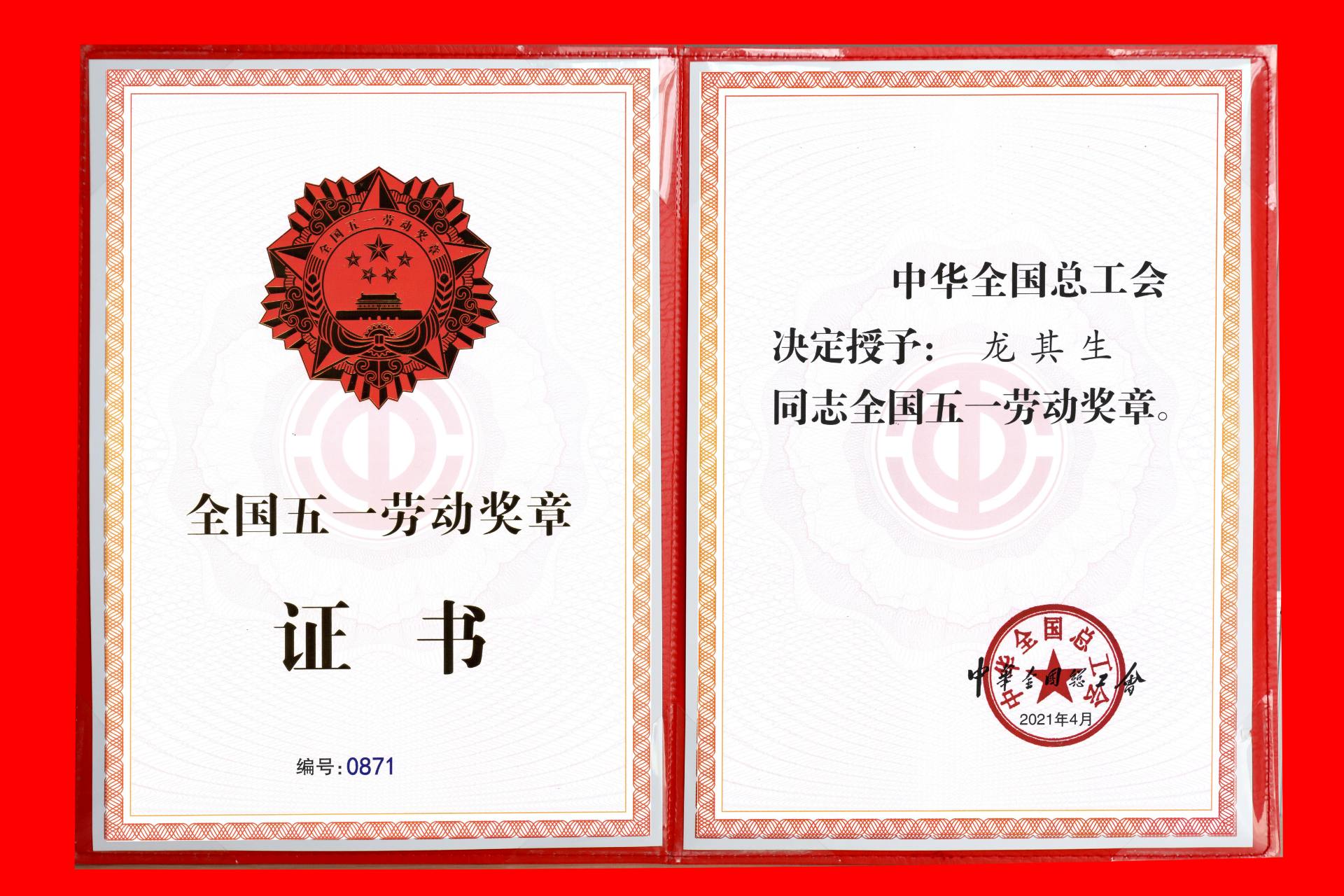 龍其生董事長(zhǎng)榮獲2021年全國(guó)五一勞動(dòng)獎(jiǎng)證書(shū)